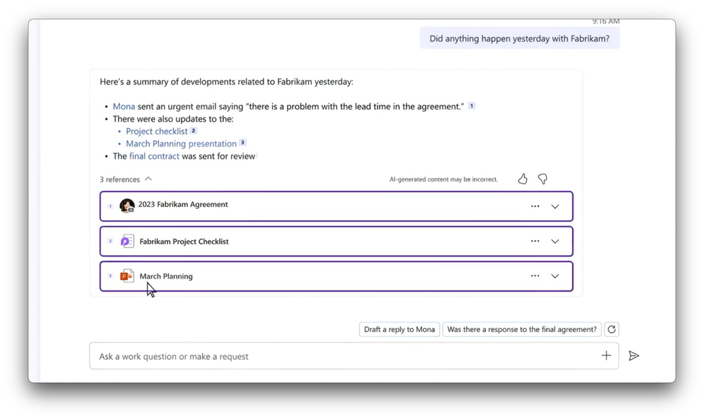 Missed an important update? Microsoft 365 Copilot integrates seamlessly with Microsoft 365 apps, utilizing Microsoft Search and the Microsoft Graph. This integration enables Copilot to provide you with swift, accurate updates, helping you catch up on essential information and saving you valuable time. Watch how it works.